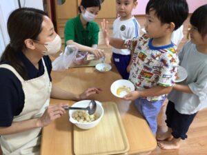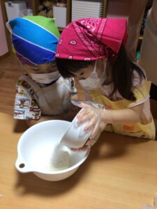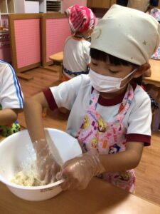 自分で作り食べる楽しさを味わうことと、衛生面に気を付て取り組むことをねらいに秋の夜を彩る行事『十五夜(お月見)』にちなんで白玉団子作りに挑戦しました。粉と豆腐を混ぜる際、椅子から立って「ぎゅっぎゅっ!」と力強く混ぜていました。また、完成した生地を一口サイズにちぎって手のひらでコロコロと丸める作業も上手に行うことができました。