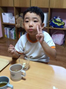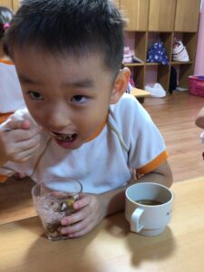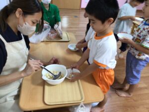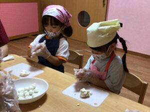 みんなで作った団子が熱いお湯に浮かび上がると、「浮いてきたね。まだかな?」と嬉しそうな笑顔がこぼれ、ゆで上がりの良い香りに気づき手で仰いで匂いをかぐ子もいました。完成後はきな粉と黒みつをかけて実食。「おいしい!おかわり!」と自分で作った達成感と格別の味を楽しみ、充実したクッキングとなりました。