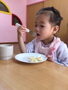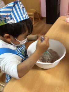 午後クラスでは、材料のミックス粉、ココアパウダー、牛乳を決められた量を自分たちで計量することから取り組みました。慎重に、はかりや計量カップの数字を見ながら材料を入れます。「まだまだ」「あとほんの少しでいいよ」「ストップ!」と言いながらぴったりの量をはかり、混ぜるときには「色が変わった!」「どんなにおい?」と変化に興味津々な様子でした。電子レンジでの調理中には「なんかいいにおいがしてきた」「早く食べたいな」とわくわくしてできあがりを待ちました。ケーキが完成すると、まってましたとばかりにあっという間にたべてしまう子どもたちでした。お友達と協力して作ったココアケーキは、特に美味しく感じられたようです。