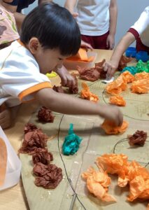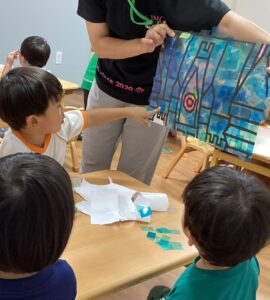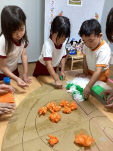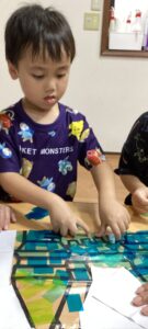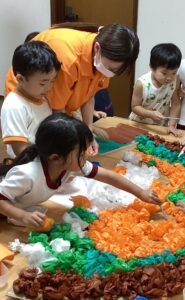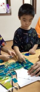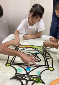 毎年8月に開催する『LINO夏祭り』。今回はディズニーの世界をテーマに、手指の巧緻性を高める・友だちと協力して作品を作り上げることをねらいとして、花紙を使用したミッキーマウスのモニュメントやカラーセロファンを使用したシンデレラ城のステンドグラスを制作しました。支援者を真似て優しい力加減でふんわりと花紙を丸め、モニュメントの写真を見ながら絵柄を作り上げていく中で、「あれ、ここの色が違うんじゃない?」と全体像を見て違いに気が付き、ことばを掛け合い修正したり、「糊、おねがいします。」と作業を分担して協力しあったりと、自然と自分の持ち場を意識して活動する姿が見られました。また、ステンドグラス作りでは、発達段階に合わせて年長児はハサミを使用することで黒枠からはみ出さないように、カラーセロファンを小さく切ることで細かい部分を作り上げることができました。透ける素材のカラーセロファンはとても魅力的で、色眼鏡のようにのぞき込んだり色を重ねて色の変化を楽しんだりしていました。放課後等デイサービスのお兄さんお姉さんたちが、児童発達支援の小さなお友だちのために、アイデアを凝らした様々な遊びのコーナーを準備して盛り上げてくれる『LINO夏祭り』、今年も楽しみです。