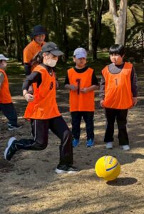 2月21日の外出活動は、「ふるさと考古歴史館(午前:キックベース、午後:勾玉作り)」へ行ってきました。「季節を感じること」そして「公共のマナーを学ぶこと」をねらいとして取り組みました。まずは、春の足音が聞こえてきそうな青空の下、考古歴史館前の広々とした芝生へ!今回はLINO2のお友達とチームを組んで、キックベースの交流戦がスタートしました。注目のバッターボックス。転がってくるボールをじーっと見極めて…「ナイスキック!!」 快音とともに放たれたヒットに、周囲からも大歓声!その後、全力疾走で駆け抜ける姿は、まるでヒーローのようにかっこよかったです。お友達同士「頑張れー!」と声を掛け合う姿に、心の成長も感じた時間でした。  お昼ごはんのあとは、いよいよふるさと考古歴史館での、「静」の時間。古代のアクセサリー、勾玉(まがたま)づくりに挑戦です!職員の方のお話を、みんな真剣な表情で聞き入ります。いざ作業が始まると、そこには驚くほどの集中力が…。「ここを削るのが難しいんだよね…」「あ!少しずつ形が変わってきた!」苦戦する場面もありましたが、石を磨く手は止まりません。「楽しい!」と瞳をキラキラ輝かせながら、丁寧に、丁寧に。最後には、自分だけの宝物が完成しました!