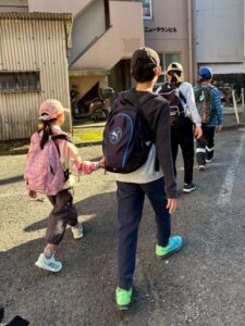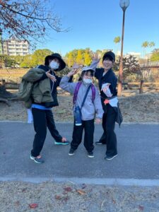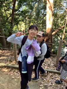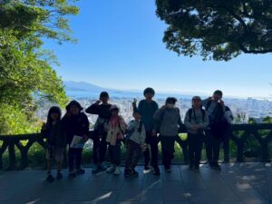 歩いている途中には、どんぐりを拾うなど、自然に触れながら季節を楽しむ様子が見られました。上学年の友だちが低学年の友だちに対し、手をつないだり、背中に手を添えたりしながら、「大丈夫?」「あともう少しだよ。頑張ろう。」と励ましのことばをかける姿が見られ、友だちを思いやる優しさを感じました。展望台に到着すると、子どもたちは笑顔を見せながら、「家はあそこら辺かな」「LINOが見えるんじゃない?」と景色を眺めつつ、友だちや支援者と会話を交わしていました。昼食後は、鬼ごっこや陣取りをして遊んだり、散策をしたりと、時間いっぱい身体を動かして楽しみました。登山後は「もう一周行きましょう」と前向きなことばも聞かれ、体力に余裕がある様子が見られました。