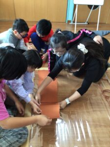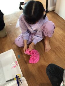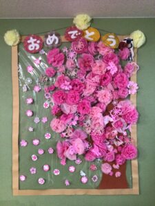 ハサミを上手に使い一生懸命切った「切り絵の桜」や、指先でふんわり丸めた「花紙の桜」、フィンガーペイントで作り上げた桜。一人ひとりが心を込めて作った花びらを合わせると、壁一面に大きな桜の木が完成しました。