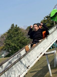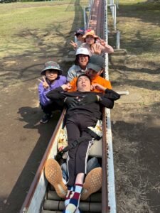 今回のハイライトは超ロング滑り台です。3月でLINOを卒業する車いすの友だちも挑戦しました。大人が支え、ゴール付近で待つ子どもたちからは「がんばれ!」「あとすこし」と途切れない応援の声が響きました。